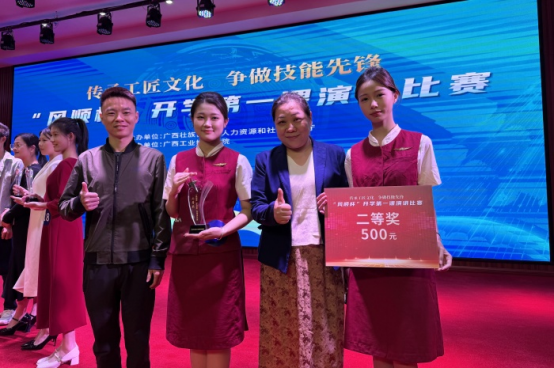 經過三個小時的激烈比(bǐ)拚,根據現場評委打分,評選出一、二、三等獎,並對獲獎學生進行了頒獎。我院參賽學生榮獲二等(děng)獎,上台領獎並與我院副院長伍陽以及評委嘉賓們合影留(liú)念。