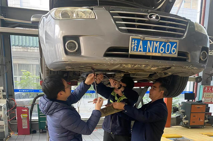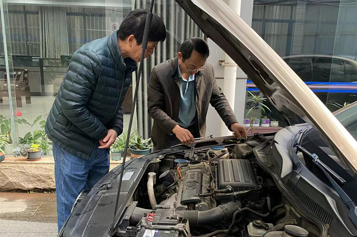毛紅孫和鹹棕標老師對(duì)車輛發動機艙進行檢查