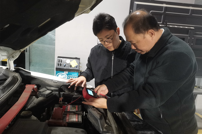 農祖軍和(hé)李懷朝老師正在對車輛蓄電池性能(néng)進行檢測