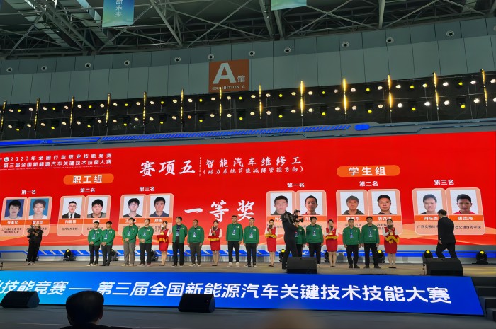 12月4日(rì)-8日,由人力資源社(shè)會保障部、中國機械工業聯合會主辦的(de)2023年全國(guó)行業職業技能競賽——第三屆全國新能(néng)源汽車關鍵技術技能大(dà)賽(以下簡稱大賽)決賽在柳州市舉辦。本次大賽(sài)屬於國家一類職業技能(néng)大賽,是(shì)我國新能源汽車領域最高水準的職業技能競賽。我院學生劉旺貴、唐佳海(hǎi)榮獲智(zhì)能汽車維修工(gōng)(動力係統節(jiē)能減排管控方向)賽項學生組一等獎,謝兆雁(yàn)、李俊(jun4)宏(hóng)榮(róng)獲汽(qì)車電氣裝調工(智能載運技術方向)賽項(xiàng)學生組三等獎;教師劉小強、朱文佳榮獲(huò)該(gāi)賽項職工組二等獎;黃忠前榮獲“優秀教練”稱號。我院學生首次在該類賽事上獲得一等獎,實現了學生獲獎等次的曆史性(xìng)突破。
