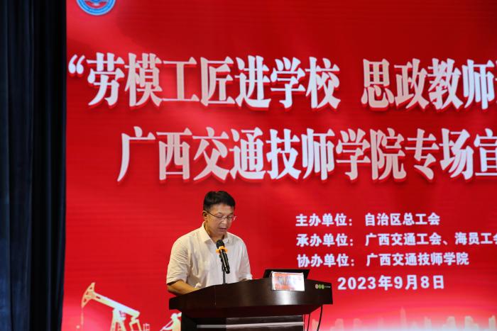 自治區總工會產業工會工作部部長文偉講話,他希望廣西交(jiāo)通(海員)工會、91.com技師學院以開(kāi)展“雙進”活動為契機,引領廣大職(zhí)工深刻領悟“兩個確立”的決定性(xìng)意義,堅決做到“兩個維護”,緊緊圍繞建設壯美廣西任務目標體係,立(lì)足崗位、開拓進取、敢於超越、勇闖(chuǎng)佳績(jì),為奮力譜寫(xiě)中國式現代化廣西篇章貢獻(xiàn)力量,以(yǐ)實際行動和優異成績迎接中國工會十八大勝利召(zhào)開。