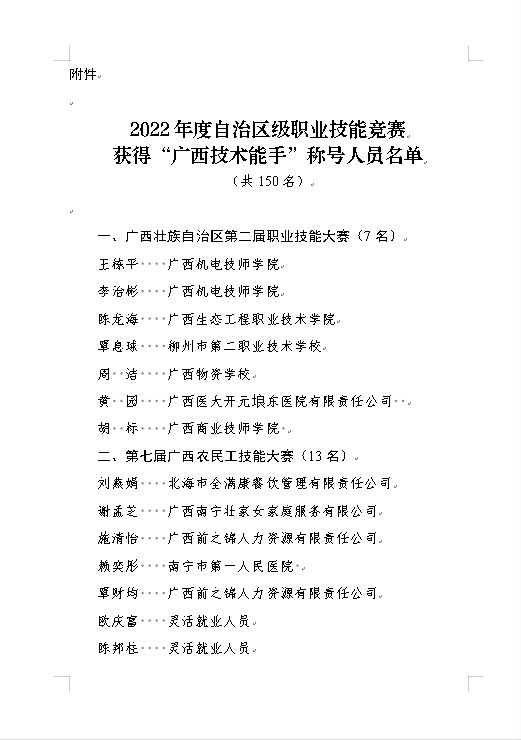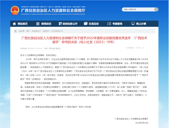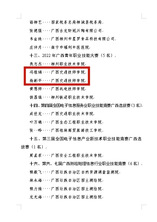 近期,廣西壯(zhuàng)族自治區人力資源和社會保障廳印發《關於授予2022年度職業技能競賽優秀選手 “廣西技術能手”稱號的決定》,我院(yuàn)楊彰平、馮程錦兩位老師在2022年廣(guǎng)西青年(nián)職(zhí)業技能大賽表現優異,被(bèi)授予“廣西技術能手”稱號,同時獲得廣西區團委授予“廣西青年崗位能手”稱號。