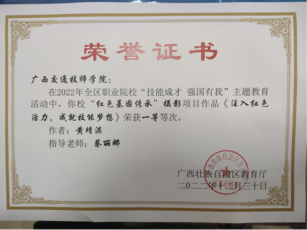 1.蔡麗娜(nà)老(lǎo)師指導黃婧淇的攝影作品《注入紅色活力,成就技(jì)能夢想》榮獲一等獎;