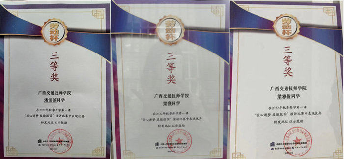 中國人(rén)力資源和社會保障出版集團於2022年9月-12月舉(jǔ)辦了“匠心逐夢 技能報國”演(yǎn)講(jiǎng)比賽視頻征集活動,我院交通工(gōng)程係潘濱濱同學(指導老師:謝少林)、梁雅倩同學(指(zhǐ)導老師:徐寅彪)和商務服務係梁熹同學(指導老師:黃煒)3人均在比賽中榮獲了三等獎的佳績。