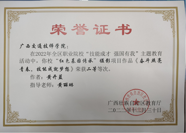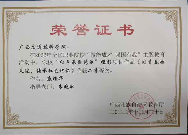 根據《自治區教育廳關於公布“技能成才強國有我(wǒ)”主題教育活動作品等次評定結果的通知》,我院在“紅色基因傳承”攝影項目中獲得了2個一(yī)等獎,3個二等獎的佳績。