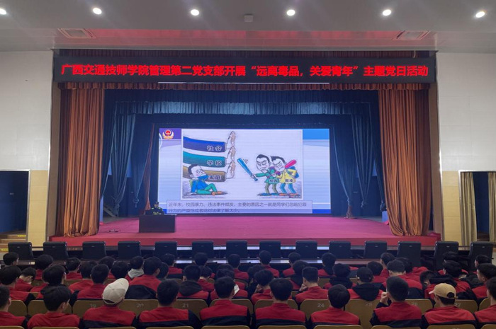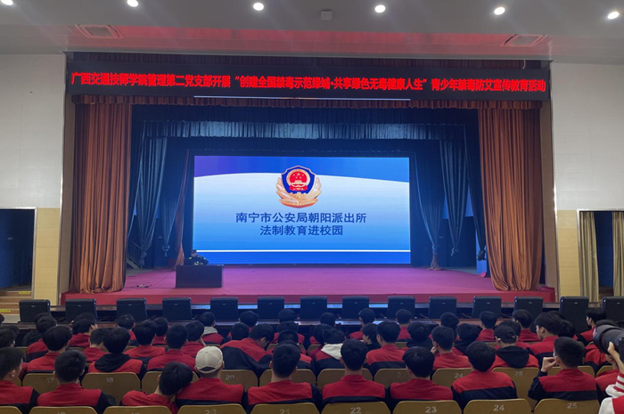 為(wéi)加(jiā)強青少年健康(kāng)成(chéng)長,創造(zào)良好的校園生(shēng)活環境及學(xué)習環境,3月15日學院管理第二黨支部與共青團南寧市興寧區委員會、興寧區禁毒(dú)辦、興寧區朝陽街道辦事處、南寧市宏德社會工作服(fú)務中(zhōng)心在學院禮堂(táng)聯合開展“創建全(quán)國禁(jìn)毒示範綠城·共享綠色無毒健康人生”青少年禁毒防艾宣傳教育主題黨日活動。