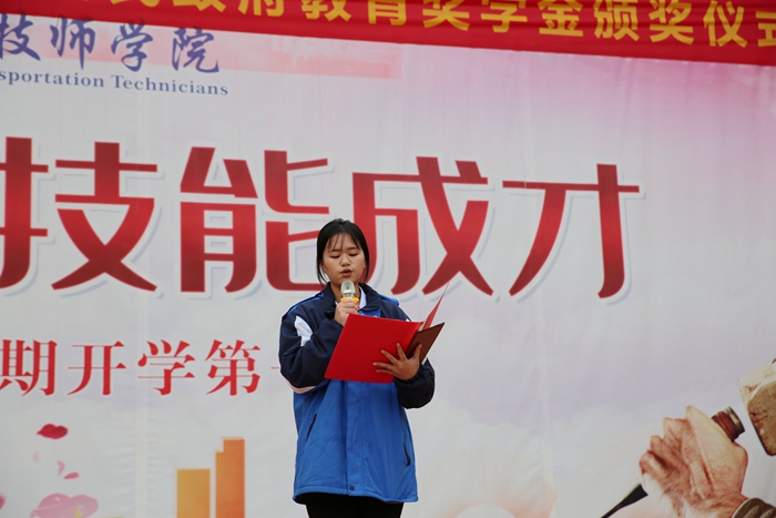 信(xìn)息工程係2021級現代物(wù)流中級工班龍佳嫻在頒獎儀式上發言。她向一直以來關心、教育和幫(bāng)助我們成長成才(cái)的各位領導、老師表示最真(zhēn)摯(zhì)的感謝和最崇高的敬意。表示,今後將腳踏實地,潛心(xīn)鑽(zuàn)研,夯實基礎,既要掌握知(zhī)識本領、身懷一技之長,也要(yào)積澱職業素養,牢固樹立敬業守信、精益求精的職(zhí)業精神。