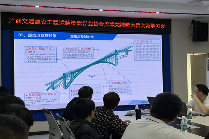 交流會上係部教師們與項目檢測(cè)試驗師主弦管內灌注C80自(zì)密實(shí)無收縮混凝土、勁性(xìng)骨架外包C60混凝土及試驗檢測等技術方麵展開了深入的交流學習
