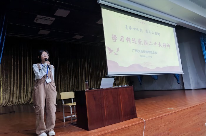 11月1日,學院長堽校區組織召(zhào)開青年學生幹部會議,學院黨(dǎng)委副書記、紀委書記韋(wéi)昌甲宣講黨的二十(shí)大(dà)精神。