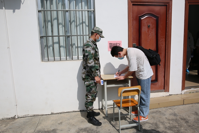 校醫在臨(lín)時隔離留觀區詢問體溫異常學生(shēng)的症狀和流行病學史(shǐ)