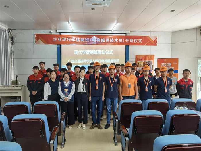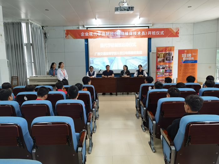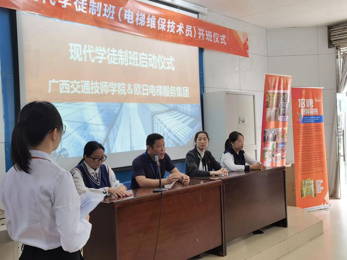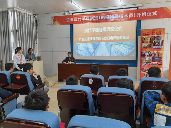 10月11日上午,我院機電工程係與廣西歐日電梯服務集團有限公司校企合作的歐日電梯現代學徒製訂單班開(kāi)班儀式(shì)在邕武校區求知樓階梯教室順利舉行。機電(diàn)工程(chéng)係(xì)主(zhǔ)任(rèn)周(zhōu)茂傑,歐日電梯公司維保(bǎo)事(shì)業部總經理張巍慰、人事部(bù)經理魏紅梅出席開班儀式,歐日電梯維保訓(xùn)練(liàn)團(tuán)隊和訂單班學生共計33人參加儀式。