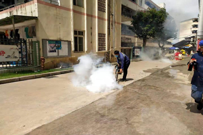 此次消殺作業采用殺蟲劑、消毒液分批次、分區域綜合投放(fàng),以煙機、水機相互配合的方式,對宿舍區、教學樓、辦公樓(lóu)、垃圾場、草叢、下水道等重點位置(zhì)進行藥物投放,有效殺滅蚊蟲、病毒,切斷(duàn)病菌的傳播途徑,保障(zhàng)師生的(de)生命安全和身體健康。