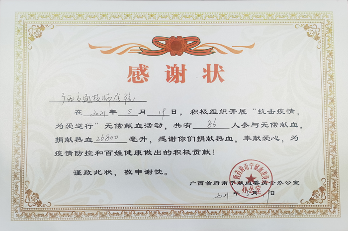 我院收到南寧中心血站感(gǎn)謝狀