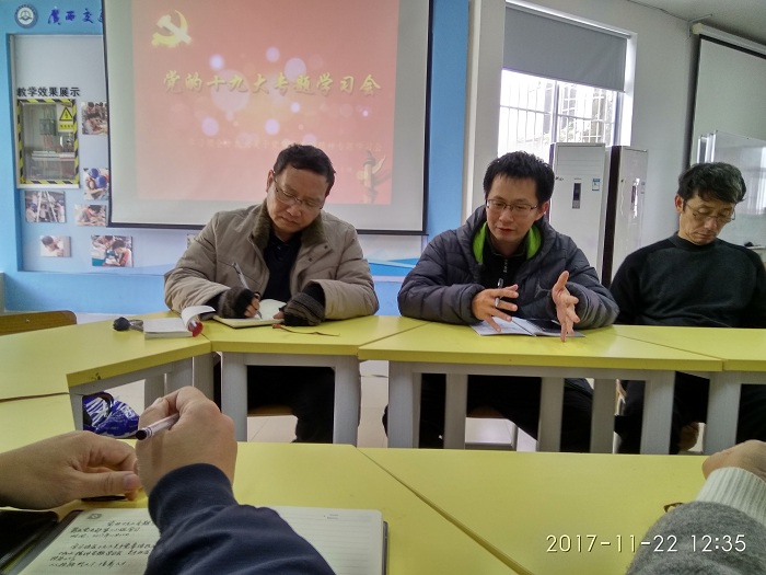 第五黨支部(bù)第二黨(dǎng)小組在邕武校區德誠樓三樓開展本次(cì)專題學習(xí)會,議題為學習領會十九大關於黨(dǎng)章修改的精神專(zhuān)題學習(xí)會(huì),會議由小組長唐李珍同(tóng)誌主(zhǔ)持。結合主題內容與自身工作崗位,紛紛發表了看(kàn)法或(huò)感想,歸納(nà)整理如下:一是“全麵建成小康(kāng)社會,一(yī)個(gè)不能少;共同富裕路(lù)上,一個不能掉隊。”對於扶貧工作,不能流於(yú)形式,搞表麵工作,要從思想上真正著手,動員(yuán)全部社會(huì)力量(liàng),做(zuò)到脫真貧、真脫貧;二是“建設知識型、技能型、創新型勞動者大軍,弘揚勞模精神和工匠精神(shén),營造勞動(dòng)光榮的社會風尚和精益求精的敬業風(fēng)氣”。作為(wéi)一名職業(yè)院校的教師(shī),培養技能能人才的任務任重而道遠,應該從思想(xiǎng)意識抓起,將“忠於崗位、忠於職業以及工匠的匠心融入到教學教育工作(zuò)中的每個(gè)細節,才能為企業的發展邁向質量時代提供技術人才的有力支持;三是“綠(lǜ)水青山就是金山銀山。”對於生態文明的(de)意識也得到了強化,要有持(chí)續發展和長期發展的全局眼光,經濟(jì)帶動需(xū)求的同時,也加快生態文明的建設和(hé)環境的優(yōu)化。