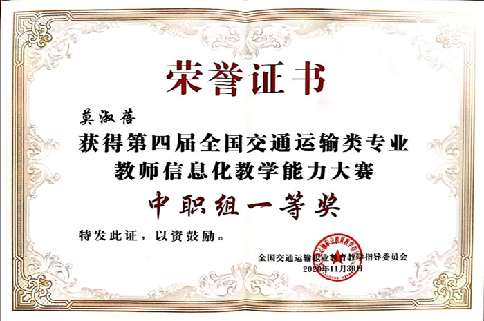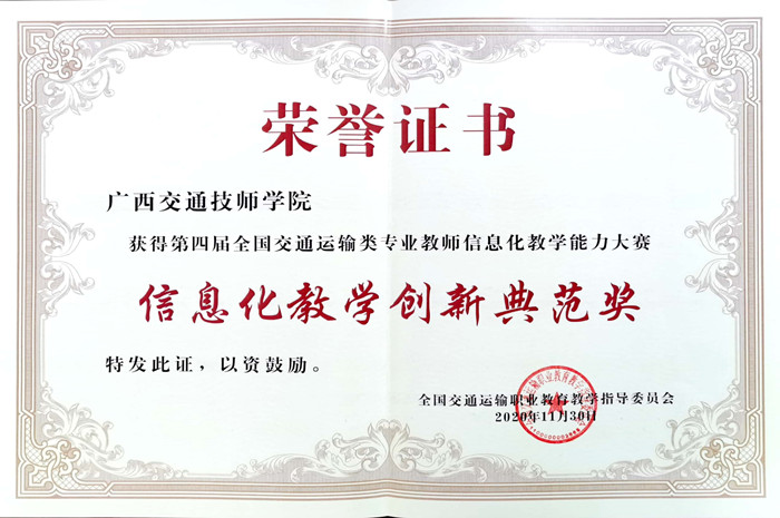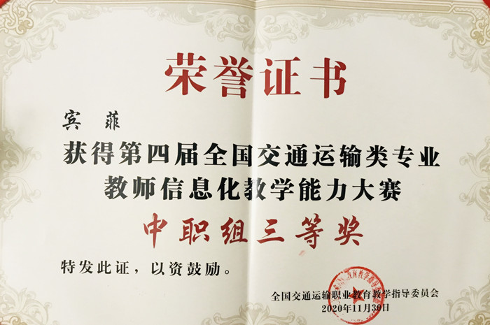 近期,第四屆全國交通運輸類專業(yè)教(jiāo)師信(xìn)息化教學能力大賽決賽於四川成都順利落下帷幕。我(wǒ)院汽車工程係莫淑蓓教師和賓菲老師分別榮獲中職組一(yī)等獎和中職組三等(děng)獎的成(chéng)績,同時學院還榮(róng)獲了信息(xī)化教學創新典範(fàn)獎(jiǎng)。