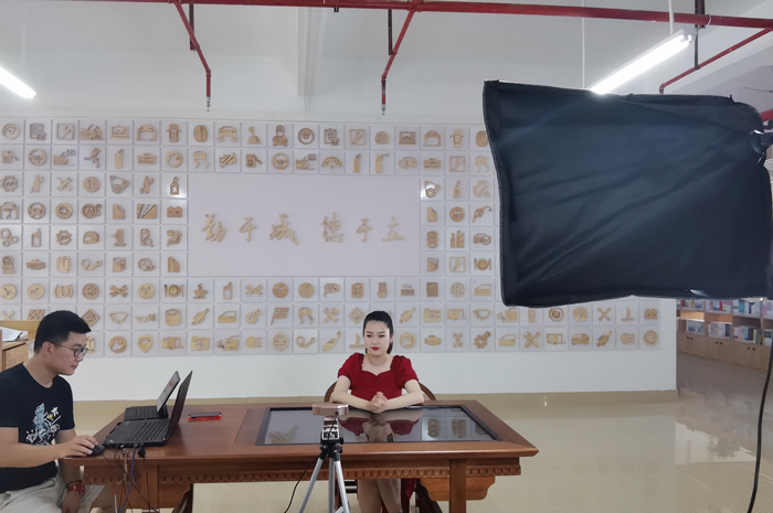 本次直播在學院圖書館進行,主持人黃穎老師在做直播前的(de)最後調試