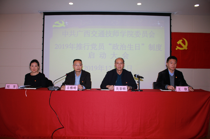 2019年12月25日下午,我(wǒ)院於綜合樓1619會議室隆重召開2019年(nián)黨委推行黨員(yuán)“政治(zhì)生日(rì)”製度啟動大會。我院黨委書記古雅(yǎ)明主持本次大會,副院(yuàn)長關菲(fēi)明,劉芳,王欽出席會議。各黨支部書記、全體在職(zhí)黨員參加會議。