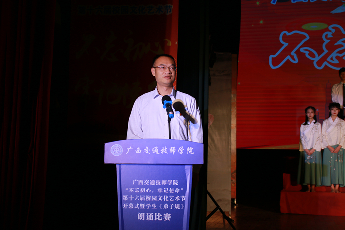 鍾修(xiū)仁院長在開(kāi)幕式上對本屆校園(yuán)文化藝術節的成功舉(jǔ)辦表(biǎo)示熱烈祝賀,並代表學院領導班子對籌備本屆(jiè)文化藝術節的師生致以誠摯的謝(xiè)意。他表示,為了深入(rù)開(kāi)展愛國主義教育和革命傳統文化教育,促進(jìn)學院校園文化建設,增強廣大師生“不忘初(chū)心,牢記使命”的政治理想信仰,本屆校園文化藝術節以“不忘初(chū)心,牢記使命”為主題,開展教職工書畫藝術展、學生《弟(dì)子規》朗誦比賽、技師(shī)“金話筒”主持人比(bǐ)賽(sài)等係列活動(dòng)。我院學子積極參與(yǔ),表(biǎo)現(xiàn)優良,充分展現了我院師生對藝(yì)術的不倦(juàn)追求和銳意進取的良好精神風貌。