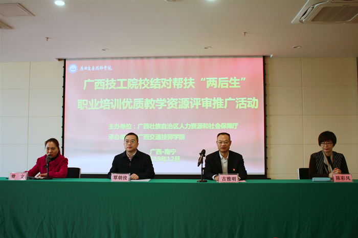 2019年12月(yuè)10-11日,由廣西壯族自治區人力資源和社會保障廳(tīng)主(zhǔ)辦,我院承(chéng)辦的廣西技工院校結對幫扶“兩後生”職業培訓優質教學資源評審推廣活動在我院綜合樓1619會議室召開。自治區技工教育研究室覃朝俊主任、曾文四級調研員,我院黨委古雅明書記,廣州市機電技師(shī)學院教(jiāo)研室主任陳彩鳳教授,以及區內30所技(jì)工(gōng)院校共計95名校領導和骨幹教(jiāo)師參加此(cǐ)次活動。