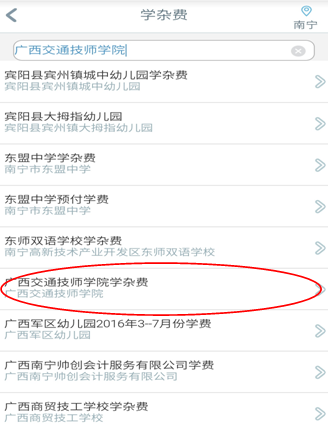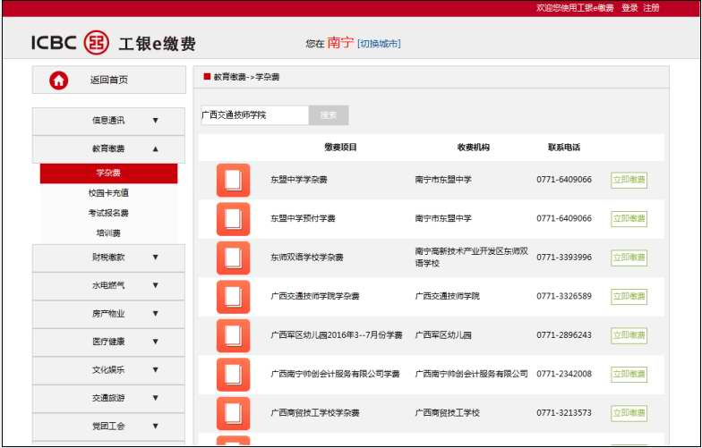 步驟4 在搜索欄內輸入“廣西交(jiāo)通技師學院”搜索找到“91.com技(jì)師學院(yuàn)學雜費”,點擊右邊“立即繳費”進入。