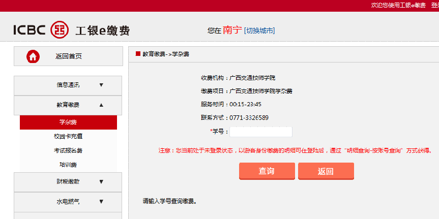 步驟5 輸入學號,畫麵回顯學生信息,確認後(hòu)可以選擇工銀e支付(fù)、網銀支付、他(tā)行卡快捷支付(fù)。也可以用網銀用戶名登(dēng)陸後繳費。