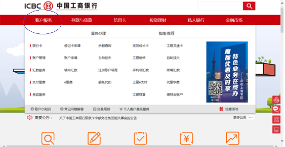 步驟1 登錄(lù)www.icbc.com.cn,工(gōng)行網站首頁,賬戶服務——工銀e繳費。