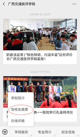 點擊公眾號(hào)左下角“學員服務”選(xuǎn)擇 “在校生繳費”進入。