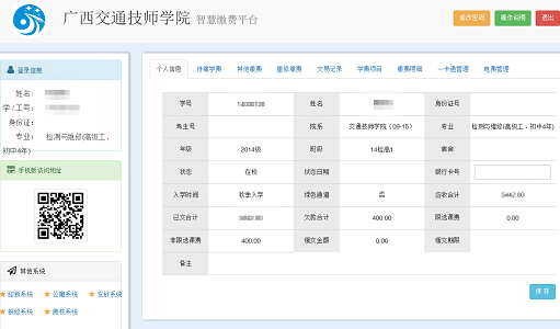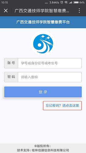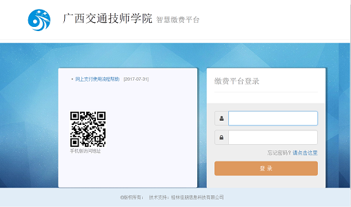 第一步:在電腦上登陸91.com技師學院智慧繳費平台(xf.gxjt.cn),輸入學號,密碼(mǎ)(如(rú)未修改15、16、17級學生默認為666666,18、19級默認為身份證後六位),點擊登陸(lù)。