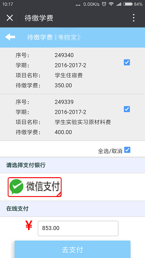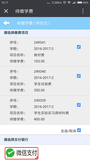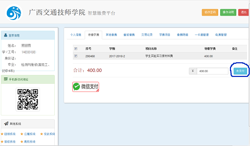 第三(sān)步:選擇待繳學費進去核對繳費(fèi)項目