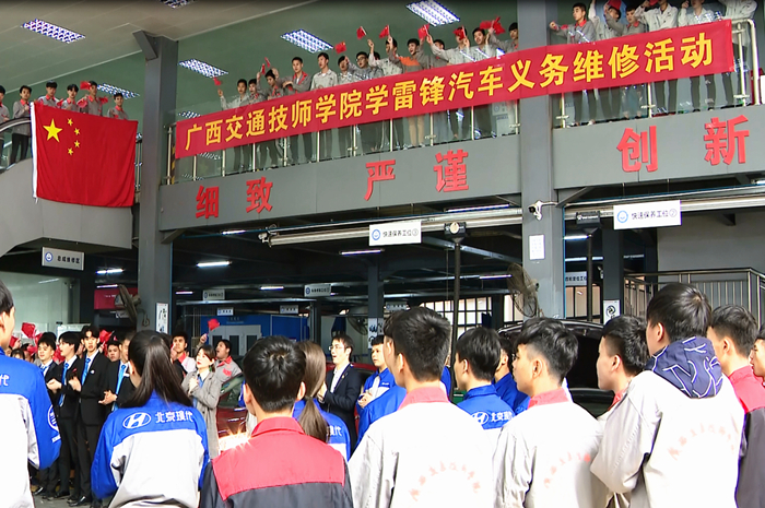 為學(xué)習和紀念雷鋒同誌,弘揚新時代螺絲釘精神,3月5日上午,在學院德能樓一樓維修車間舉行的汽(qì)車義務維修“快閃”活動,拉開了我院“學習雷鋒活動月”序幕。活動得到了許(xǔ)多車主的積極參與,並(bìng)受(shòu)到了南寧電視(shì)台的報道。