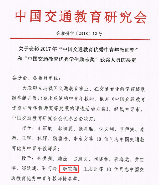 我院(yuàn)李宣葙老師(shī)喜獲(huò)2017年中國交通教育優秀中(zhōng)青年(nián)教師(shī)提名獎