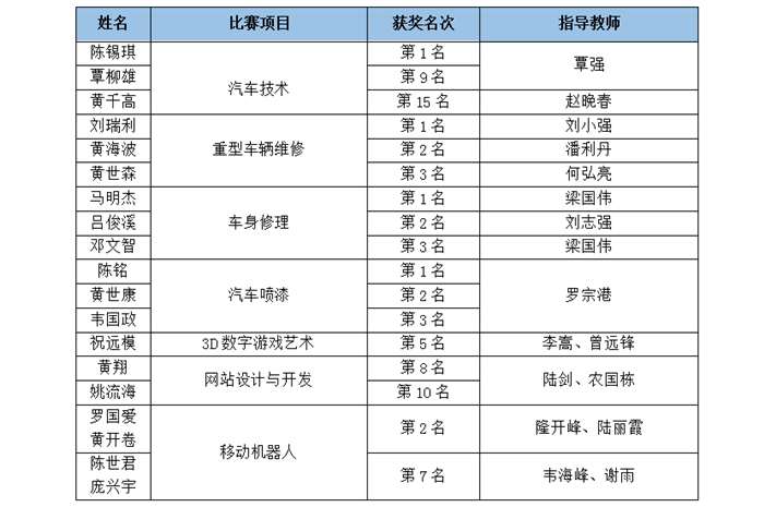 近日,第(dì)45屆世界技能大賽廣西選拔賽圓滿落(luò)幕,我院學生在(zài)汽車(chē)技能、重型車(chē)輛維修、車(chē)身(shēn)修理、汽(qì)車噴(pēn)漆(qī)、3D數字遊戲藝術、網站設計與(yǔ)開發、移動機(jī)器人等7個比(bǐ)賽項目中取得優異成(chéng)績。