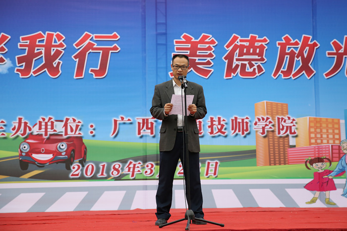 古雅明書記為活動致辭,他表示,我院自2013年(nián)創建了全國第一(yī)所安全(quán)節能文(wén)明駕駛(shǐ)公益學校,並逐步建(jiàn)成了開放公益大課堂、駕(jià)駛員綜合能力測(cè)評、網絡服務、文明(míng)駕駛教育示範等4個窗口(kǒu)基地。這些基地(dì)的建(jiàn)成,使安全(quán)節能文明駕駛滲透人心,促進了我院和行業主管部門、企事業單位的共同關注安全節能文(wén)明駕駛公益傳播(bō)事業,造就了(le)一支通曉安全、節能、文明駕駛知識的(de)多樣化師資隊伍,形成了富有行業特色的安全節能文明駕駛(shǐ)公益文化。2017年,我院成為全國唯一一所榮獲“首屆全國文明校園”至高榮譽的全日製技工類院校,也是廣西唯一一所(suǒ)獲此殊榮的中職院校。古雅明書記希望我院師生共同珍惜、維護(hù)這份來之不(bú)易的榮(róng)譽,加強文明素養、文明習慣的養成(chéng),通過本次(cì)公益大課堂活動,牢固(gù)樹立“人人需要文明交通,交通需要人(rén)人文明”的交通安全理念,鞏固全國文明校園建設成果。