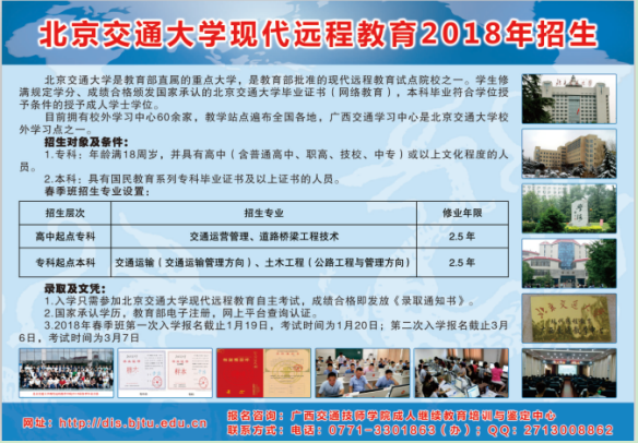 北京交通大學是教育部直屬的重點大學,為教(jiāo)育部批準的現代遠程教育試點院校之一。我自2002年與北京交通大學聯合辦學以來,每年麵(miàn)向社會和學校招生,主要(yào)有(yǒu)高起專、專升本兩個層次,以教學豐(fēng)富(fù)、文化底蘊深厚、學習形式輕鬆一直深受廣大學員的喜(xǐ)愛和好評(píng),每年都有大批在(zài)職學員慕名前來報考。同時(shí),北京交(jiāo)通(tōng)大學現代遠程教育為我院學生學曆提升(shēng)提供了通道,解(jiě)決了畢業(yè)生因學曆不足而遇到的工資待遇、人事考試、職稱評定、考證(zhèng)、留學等問題。聯合辦學以來,每年累計都有數百名(míng)學生取得專科或本科畢業證書。熱烈歡迎廣大學員前來(lái)我院報讀,我們將以熱情的服務圓您一個大學夢(mèng)!