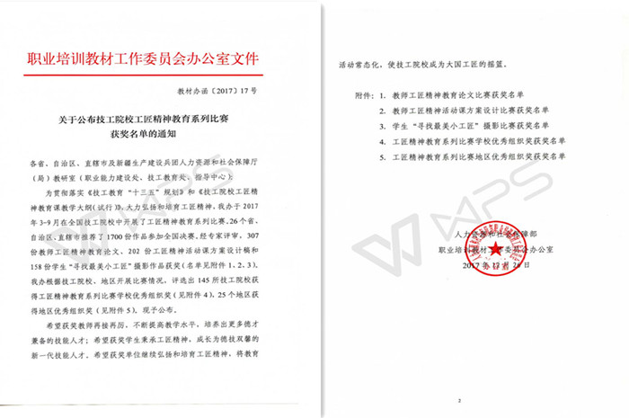 12月28日,根據人力資源和(hé)社會保障部職業培訓教材工作委員會辦公室文件《關於(yú)公布技工院校工匠精神教育係列比賽獲獎名單的通知》(教材辦函〔2017〕17號)獲悉,我院陸丹丹老師的作品《因為專注,所以專業——學習(xí)工匠精神 爭做工(gōng)匠型人才》榮獲工(gōng)匠精神活動(dòng)課方案設計一等獎(jiǎng),16維(wéi)中三班學生莫鑫民的攝影作品《刻苦訓練(liàn),精益求精》(指導教(jiāo)師:蔡麗娜)在學生(shēng)“尋找最美小工匠”攝(shè)影比賽相機組中獲獎。同時,我院也榮獲優秀組織獎的稱號。