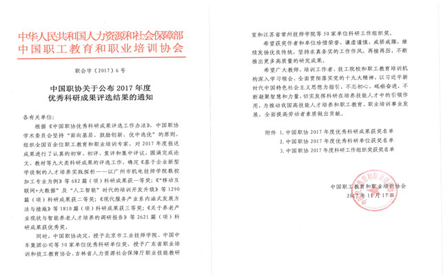 近日,根(gēn)據(jù)中國職工教育(yù)和職業培訓(xùn)協(xié)會《中國職協關於公(gōng)布2017年度科研(yán)成果評選(xuǎn)結果的通知 》(職會字〔2017〕6號(hào))文(wén)件獲悉,我院報(bào)送的14項成果全部獲獎(jiǎng),其中,一(yī)等獎4項,二等獎2項,三等獎5項,優秀獎(jiǎng)3項。