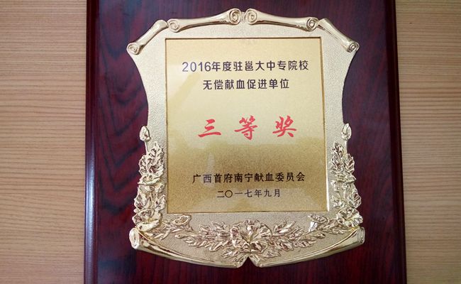 喜訊(xùn)!2017駐邕大中專院校無償(cháng)獻血工作會議於9月28日在南寧市(shì)桃源飯店會議廳進行,我院榮獲2016年度駐(zhù)邕(yōng)大中專院校無償獻血促(cù)進單位三(sān)等獎的殊榮。