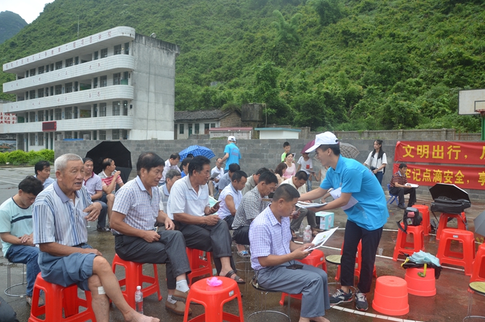 圖:誌願者給參加交通(tōng)安全知識(shí)大課堂的村民發放交通安全知識宣傳單頁