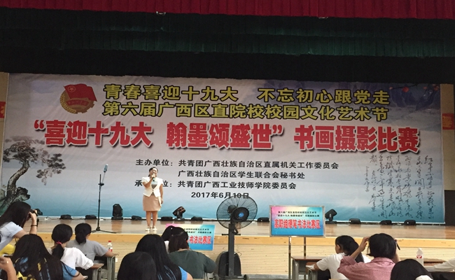 由共青團廣西壯(zhuàng)族自治區直屬機關工作(zuò)委員會和廣西壯族自治區學生聯合會秘書處主辦,共青團廣西工業技師學院委員會承辦的2017年“青春(chūn)喜迎十九(jiǔ)大 不忘初心跟黨走”第六(liù)屆廣西區直院校校園文化藝術節“喜迎十九大 翰墨頌盛世”書畫攝影比賽於6月10日在廣西工業技師學院禮堂舉行,其中書法繪畫(huà)比賽采取現(xiàn)場比賽的方式進行,攝影比賽采(cǎi)取選(xuǎn)送作品參賽的方式進行。