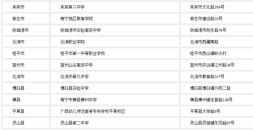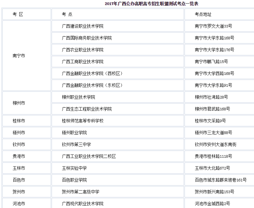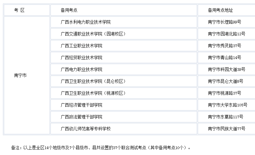 在全區14個地級市(shì)及7個縣級市、縣共設置37個聯合測試考點(其中備用考(kǎo)點10個),考生以(yǐ)就近(jìn)和方便(biàn)為原則進行報(bào)名。具體考點詳見“2017年廣西公辦高職高專招生聯盟測試考點一覽表(biǎo)”。