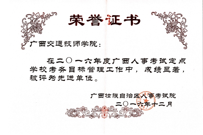 近日,我院(yuàn)由於工作成績顯著,在2016年度廣西人事考試定點學校考務目標(biāo)管理工作考核中,被(bèi)評為“先進單位”。