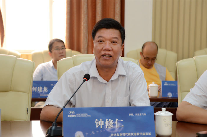 參觀結束後,“北京現代班”優秀合作院校教(jiāo)學成果展在學院六樓會議室舉行,我院與各個兄弟學(xué)校、項(xiàng)目學校的到訪人員進行了深入交流和探討。成果展由北京現代班項目組(zǔ)組長劉朋主持,他向與會人員簡要介紹了我院“北京現代班”項目所獲得的成績,並高度肯定了我院在(zài)該校企合作項目上所取得的優秀教學成果。隨後,我(wǒ)院院長鍾(zhōng)修仁在(zài)致辭中簡要介紹了我院的發展情(qíng)況,並代(dài)表學院對與會人員的到來(lái)表示熱烈歡迎,他表示真誠希(xī)望能與各個(gè)兄弟學校、項目學校深(shēn)入交流,收獲寶(bǎo)貴的(de)發展(zhǎn)經驗。會上(shàng),汽車工程係主任樊海林、信息與商務係主任封桂炎分別詳細介紹了我院“北(běi)京現(xiàn)代班”和“北京現代服務營銷班”發(fā)展情況(kuàng)。
