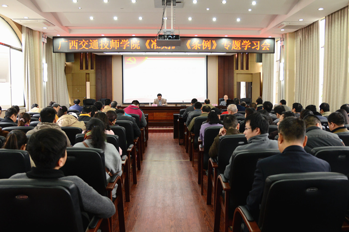 1月8日下午,我院(yuàn)黨委召開全體黨員及中層以上領導集中學習會,專題學習《中國共產(chǎn)黨廉潔自(zì)律(lǜ)準則》、《中國共產黨紀(jì)律處(chù)分條例(lì)》(以下分別簡稱(chēng)《準(zhǔn)則》、《條例(lì)》)。學院黨委書記(jì)羅華做專題(tí)發言,院長鍾修仁主持(chí)會議(yì)。