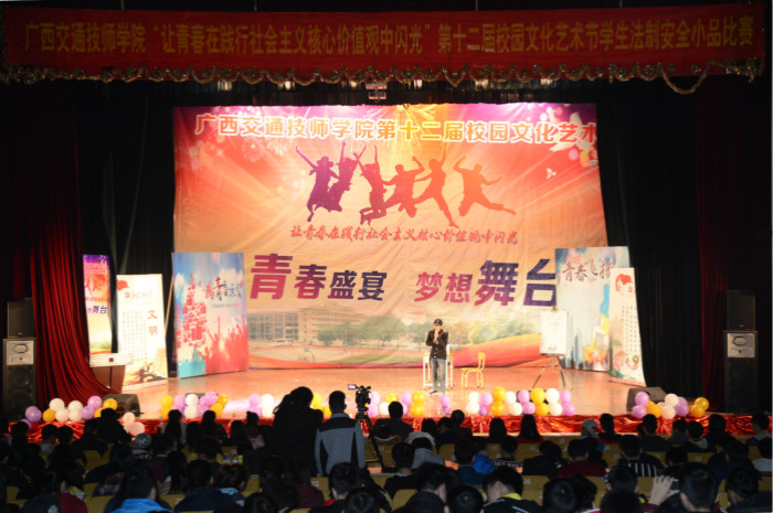 12月14日晚,廣西(xī)交通技師學(xué)院“讓(ràng)青春在踐行社會主義核心價值觀中閃光(guāng)”第(dì)十二屆校園文(wén)化藝術節法製安全(quán)小品決賽在學院禮堂成功舉行。從預賽脫穎而(ér)出的12個班級進入(rù)決賽。學院通過舉辦安全法製小品比賽活動,促使學生“知法(fǎ)、學法、守法,與法同行(háng)”,學(xué)會遵紀守法,提高自(zì)我保護的意識。