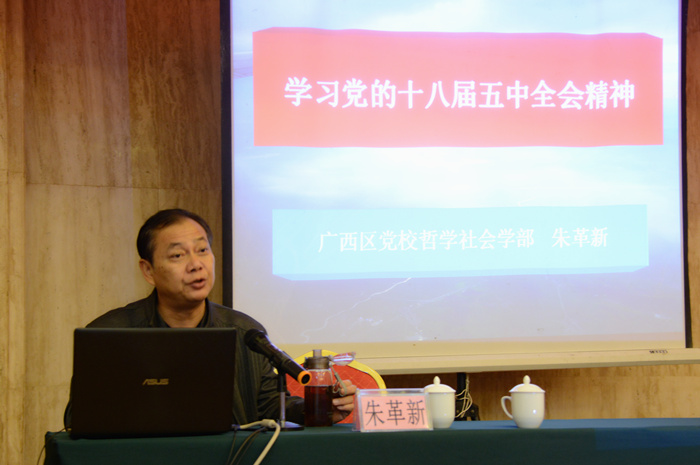 此次培訓從1125日(rì)至27日,在(zài)三天的時間裏,培訓班將采取集中授課、參觀學(xué)習、座談(tán)交流相結合的方式,先後(hòu)由自治區黨(dǎng)校哲學部副主任朱革新,區直機關(guān)黨校原校長李金慶,自治區交通運輸廳綜合管理(lǐ)處(chù)處長胡華(huá)平,自治區黨校文史部主任賀先平,自治區黨(dǎng)委宣傳部副部長、自治區講師團團長李海榮分別就(jiù)“黨的十八屆五中(zhōng)全會(huì)精神解讀”、“以社會(huì)主(zhǔ)義核心價值體係引領(lǐng)兩新組織企業文化建設”、“中國東盟國際物流發展分析”、“認真落實‘三嚴三實’,促進兩新組織黨員幹(gàn)部作風轉變”以及“以黨建推動企(qǐ)業健康發展”等主題開展專題講座。