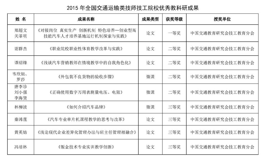 近(jìn)日,中國交通教育研究會技工教育分會發布(bù)了全國交通運輸類技師技工院校優秀教科研成果評比結果。根據中國交通教育(yù)研究會技(jì)工教育分會《關於公布2015年優秀論文、微課(kè)和精(jīng)品課程評選(xuǎn)結果的通知》(交教研技字(zì)[2015]9號)文件獲悉,我院選送的9項教科研成果在評比(bǐ)中全部獲獎(jiǎng),為我院教研成果建設再添重彩一筆。
