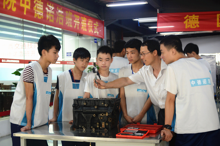 中德諾浩汽車職教課(kè)程是引進德國汽車職業教育資源,結合我國實際研製開發的一套適合我國國情的高素質、高技能汽車人才培養(yǎng)體係。其最(zuì)大特點是,通過引進德國雙元製的課程體係和辦(bàn)學模式,培養具有掌(zhǎng)握汽車機電診斷與維修(xiū)技術的(de)汽車醫生,以及掌握汽車新技術、具備國際服務理念(niàn)的新一代高素質、高技能汽車專門人才。所有專業課程全部在與教材(cái)匹配的汽車實訓室進行,學生在課堂(táng)上即可直接學習到(dào)企業工作一線的實際案例,並按照企業工作流程進行實操訓(xùn)練(liàn),使其在校(xiào)期間即(jí)能學到企業所需技(jì)能。