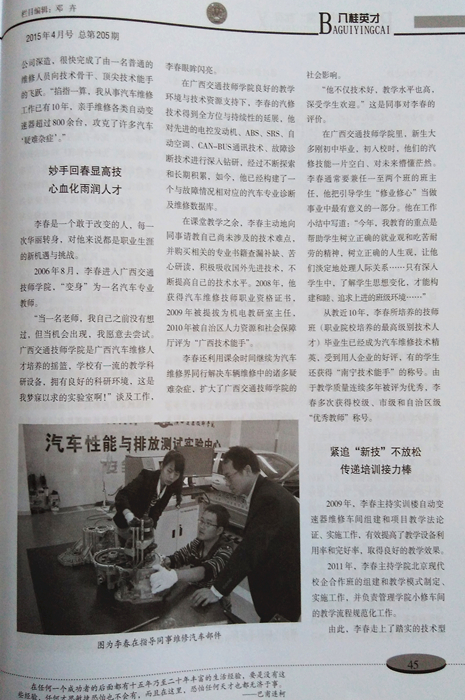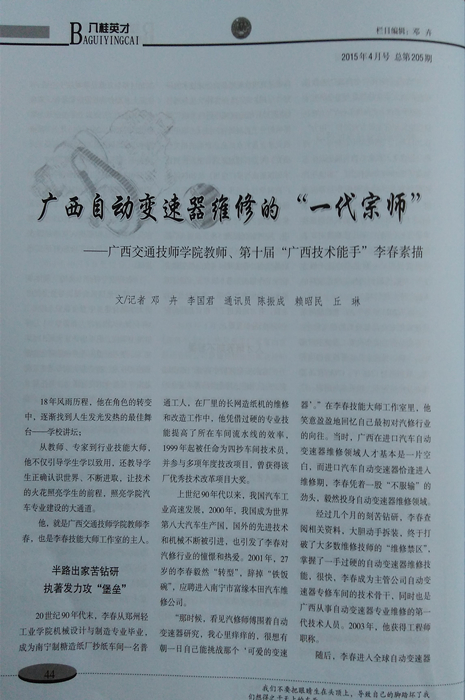 2015年 《人事天地》 廣西自動變速器維修的“一代宗師”——廣西(xī)交通(tōng)技師學(xué)院教師、第十屆“廣西技術能手”李春素描