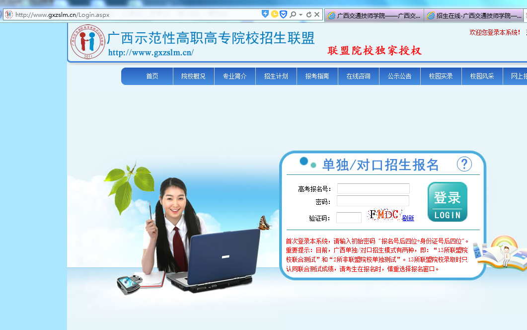 方法(fǎ)三:直接選擇(zé)招生院校,從招(zhāo)生院校網站進入聯合測試網站http://www.gxzslm.cn填寫報名信息、填寫誌願。