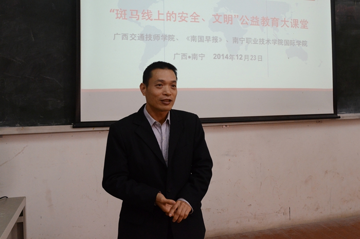 12月23日,由我院主辦,以“傳(chuán)播(bō)公益,文明你我”為(wéi)主題(tí)的安全節能文明駕(jià)駛公(gōng)益教育大課堂廣西高校行(háng)宣傳活動在南寧職業技師學院國際學院拉開序幕。本次(cì)活動得到了南寧職業技術(shù)學院的重視以及《南國早報》等(děng)新(xīn)聞媒體的關注與支持,南寧職業技(jì)術學(xué)院國際學院黨委書記、院長許康(kāng)平(píng),副書記、副院長包虹明出席了(le)此次活動,南寧職業(yè)技術學(xué)院100多名師生到場(chǎng)聽課。